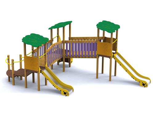 3 torres de 0,75 x 0,75 m, con tejados 1 agua Copa Árbol, acceso Eko 3 rellanos, escalerilla Eko, puente curvo, puente inclinado y 3 deslizadores, 2 de H= 0,90 m y 1 de H= 1,20 m.